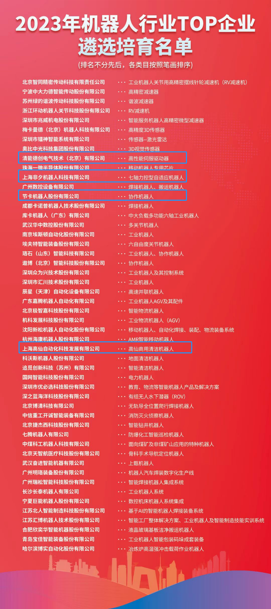 2023年10月,中国机械工业联合会机器人分会会同全国22家省市行业协会共同开展了机器人行业 TOP 企业遴选培育工作。旨在推动机器人企业加强专业化差异化发展,锻长板补短板,不断培育和壮大具有生态主导力和核心竞争力的机器人优质企业,遴选出一批创新能力强、在供应链发挥主导作用、在赋能经济社会数字化转型和支撑人民美好生活取得较好成果的企业,形成中国机器人行业TOP企业矩阵。