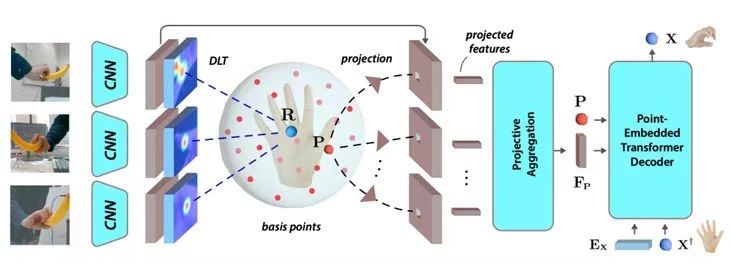 在自动化标注第一模块中,针对复杂的灵巧操作手部姿态估计和跟踪,项目组创新性地使用了空间基点集作为特征基,融合随机多视角的观测,进而通过点集注意力网络输出手部姿态控制点,并以逆运动学重定向到同构型双臂灵巧机器人,完成相应的操作任务。